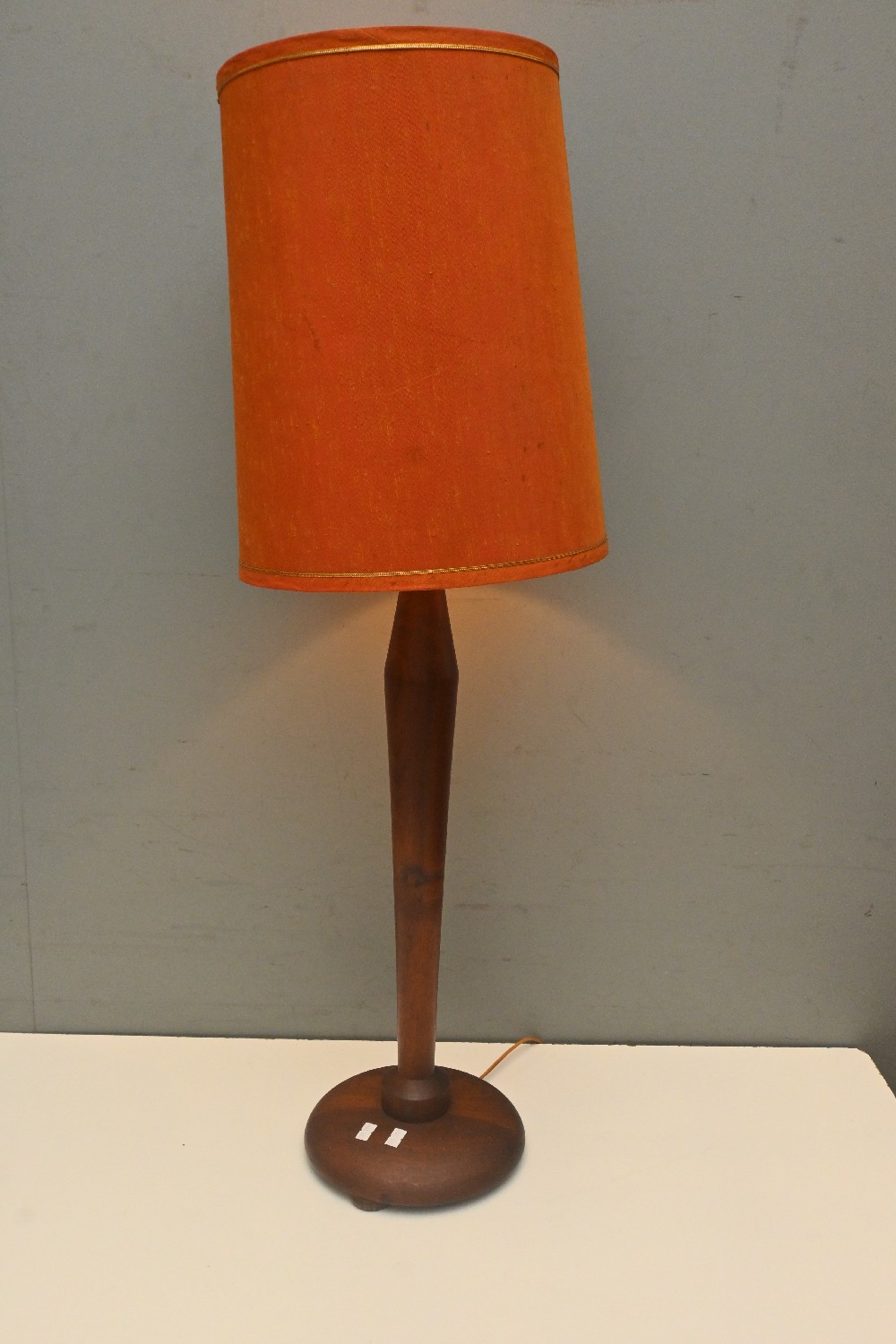 A 1960S TEAK TABLE LAMP WITH ORANGE MATERIAL SHADE FOR MAYFIELD (A/F) (95H CM) (LEONARD JOEL DELIVERY SIZE: MEDIUM)