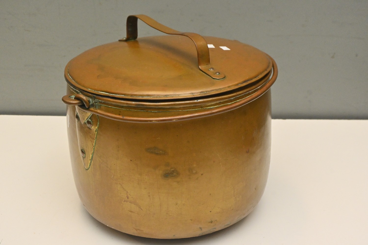 A LARGE 19TH CENTURY FRENCH BRASS LIDDED SWING HANDLED POT (36H X 45W X 40D CM) (LEONARD JOEL DELIVERY SIZE: MEDIUM)