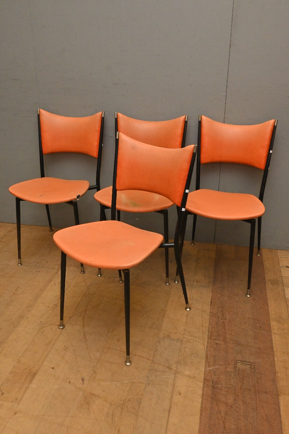 A SET OF FOUR 1960s ARISTOC 'MITZI' CHAIRS IN ORANGE VINYL (A/F) (80H X 43W X 36D CM) (LEONARD JOEL DELIVERY SIZE: LARGE)