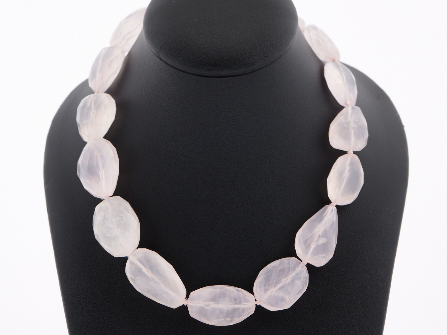 A STRAND OF FACETED ROSE QUARTZ BEADS TO A CLASP IN SILVER, 450MM