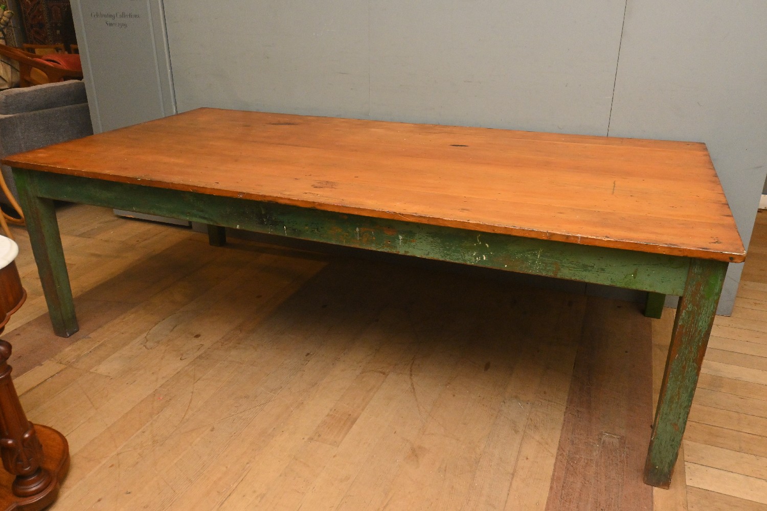 A HARDWOOD FARMHOUSE-TYPE DINING TABLE (A/F) (76H X 244W X 122D CM) (PLEASE NOTE THIS HEAVY ITEM MUST BE REMOVED BY CARRIERS AT THE CUSTOMER'S EXPENSE. LEONARD JOEL STAFF CANNOT ASSIST CARRYING THIS ITEM) (LARGE ITEM)