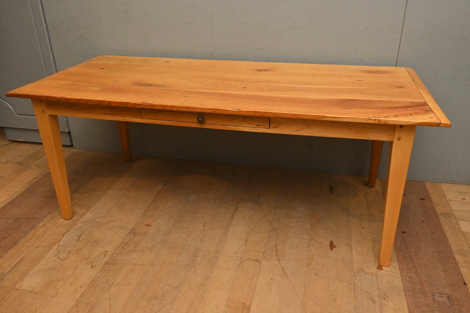 A BLONDEWOOD DINING TABLE WITH SINGLE DRAWER (76H X 198W X 87D CM) (PLEASE NOTE THIS HEAVY ITEM MUST BE REMOVED BY CARRIERS AT THE CUSTOMER'S EXPENSE. LEONARD JOEL STAFF CANNOT ASSIST CARRYING THIS ITEM) (LARGE ITEM)