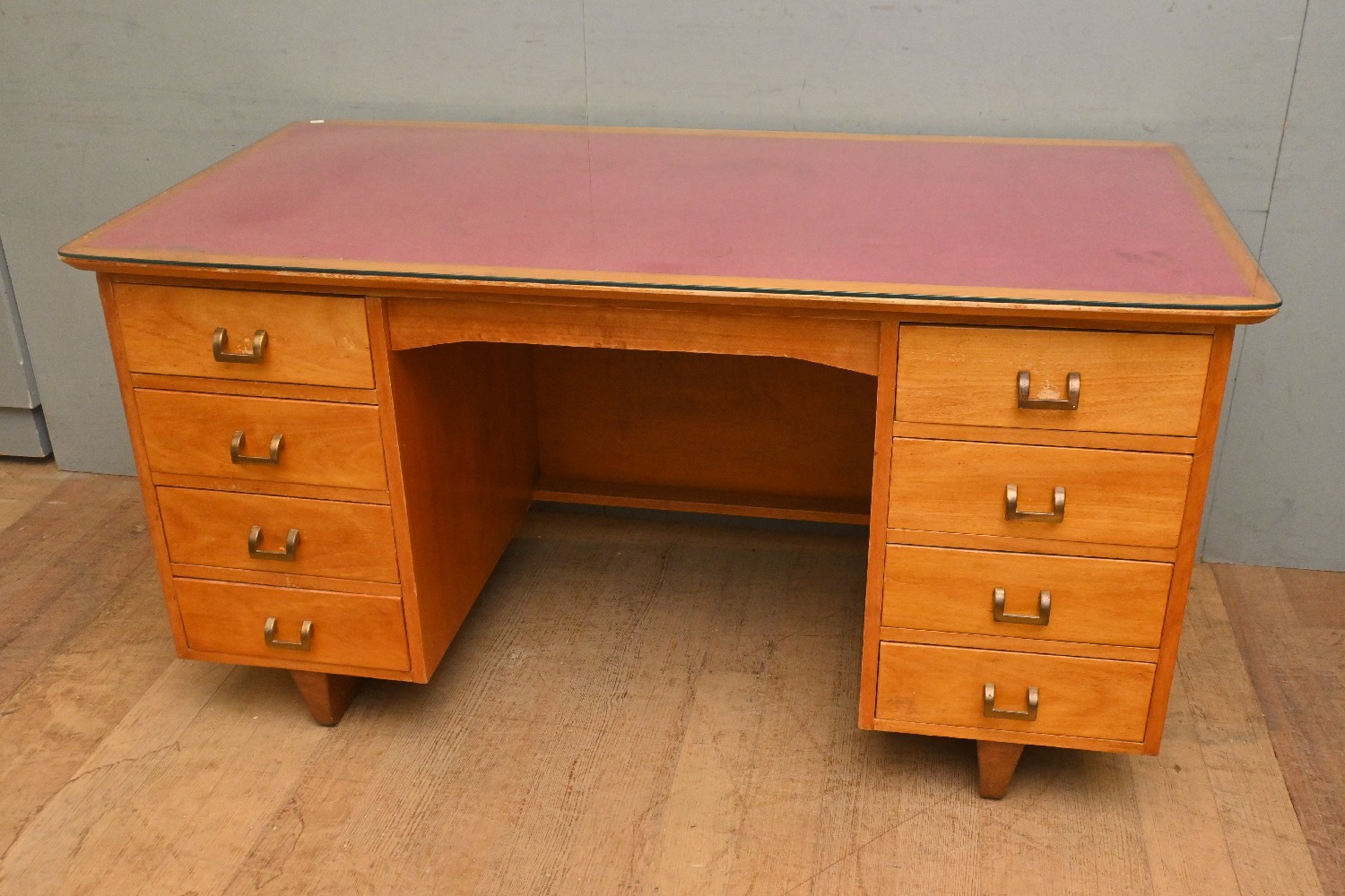 A MID-CENTURY EIGHT DRAWER FELT INLAY DESK WITH GLASS TOP (A/F) (77H X 145W X 76D CM) (PLEASE NOTE THIS HEAVY ITEM MUST BE REMOVED BY CARRIERS AT THE CUSTOMER'S EXPENSE. LEONARD JOEL STAFF CANNOT ASSIST CARRYING THIS ITEM) (LARGE ITEM)