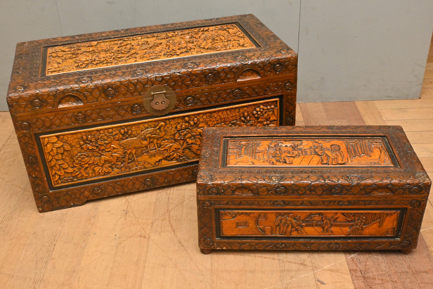 A LARGE CARVED CAMPERWOOD TRUNK AND ONE OTHER (A/F) (48H X 101W X 52D CM) (LEONARD JOEL DELIVERY SIZE: X-LARGE)
