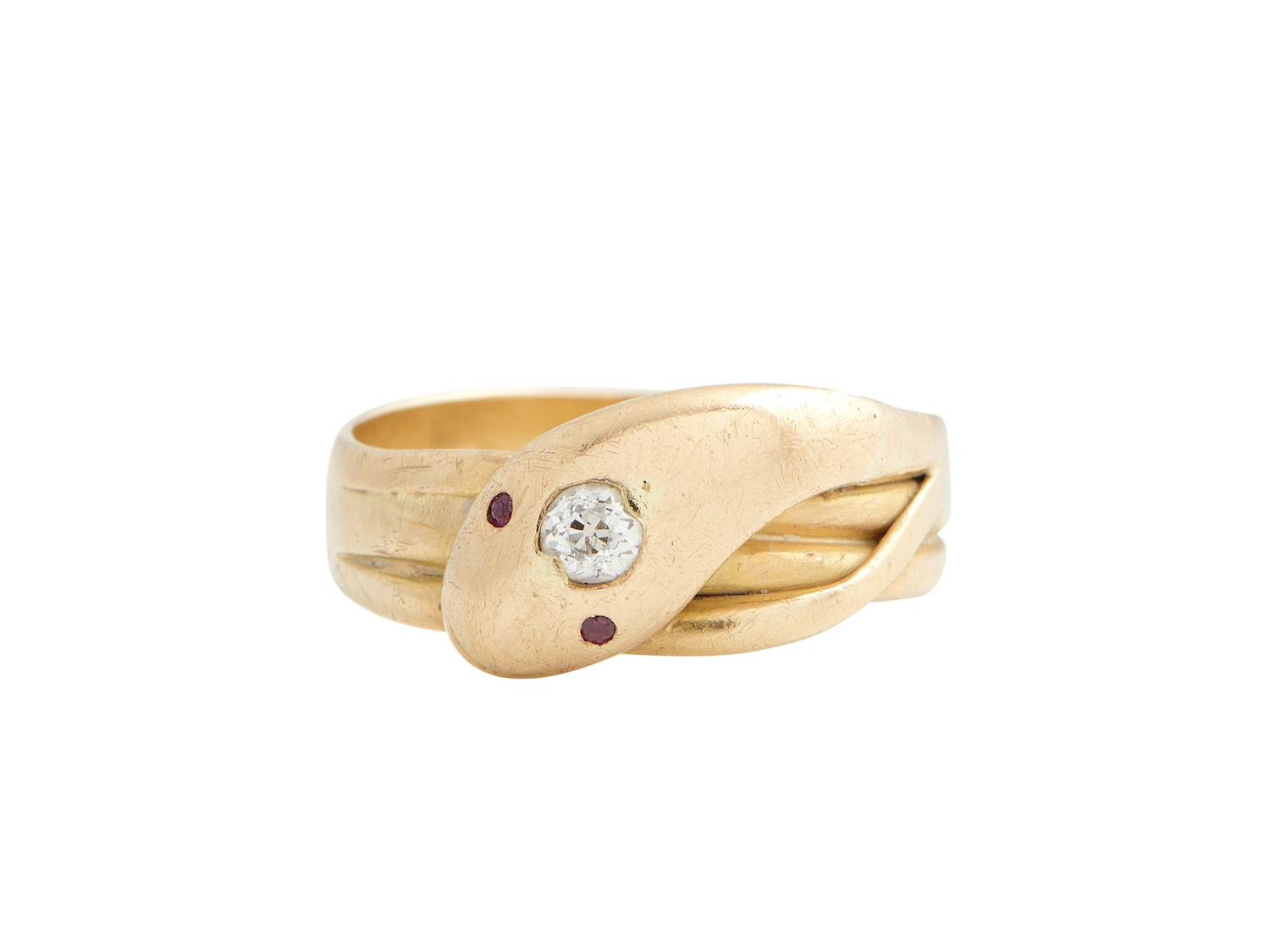 Modelled as a coiled snake, the head collet-set with an old European-cut diamond, the eyes set with rubies, mounted in 18ct gold, size O, gross weight approximately 5 grams.