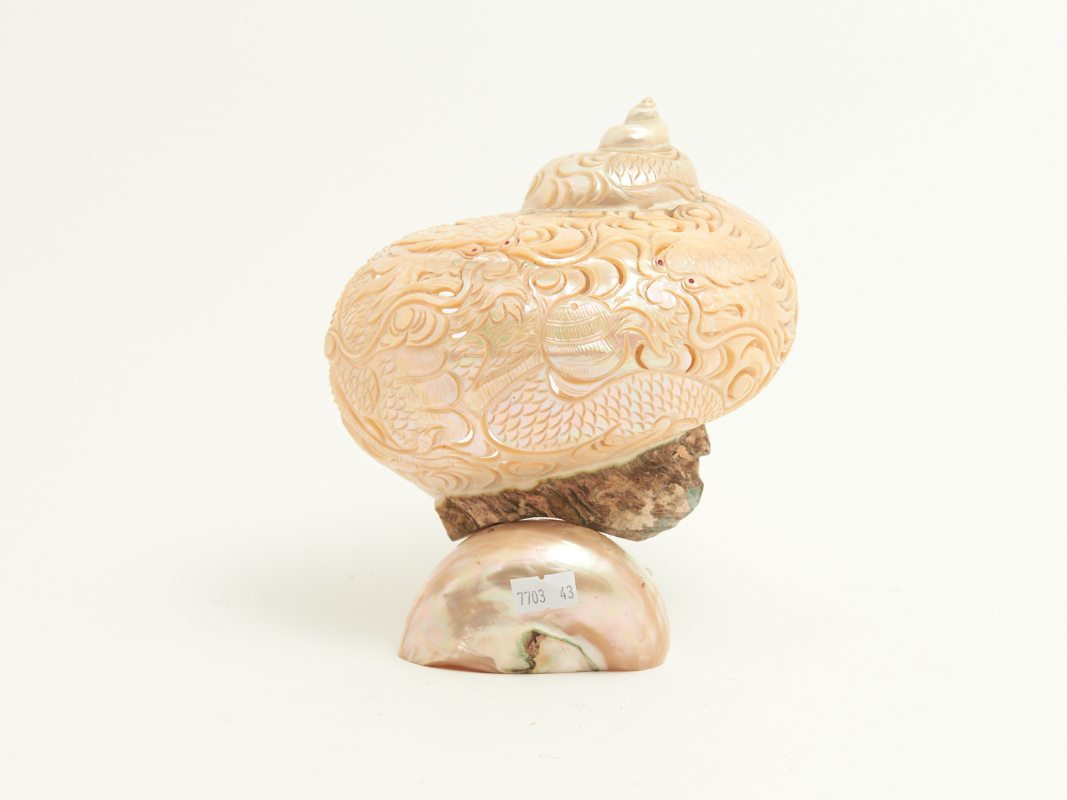A 19TH CENTURY CHINESE HEAVILY CARVED DRAGON CHASING PEARL SHELL ORNAMENT H.19CM, LEONARD JOEL LOCAL DELIVERY: SMALL