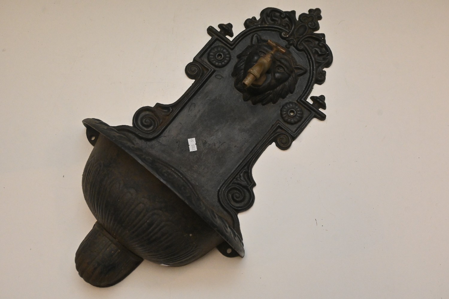A 19TH CENTURY ENGLISH CAST-IRON LION ADORNED TWO PIECE WALL MOUNTED WATER FOUNTAIN (60H X 34W CM) (LEONARD JOEL DELIVERY SIZE: MEDIUM)