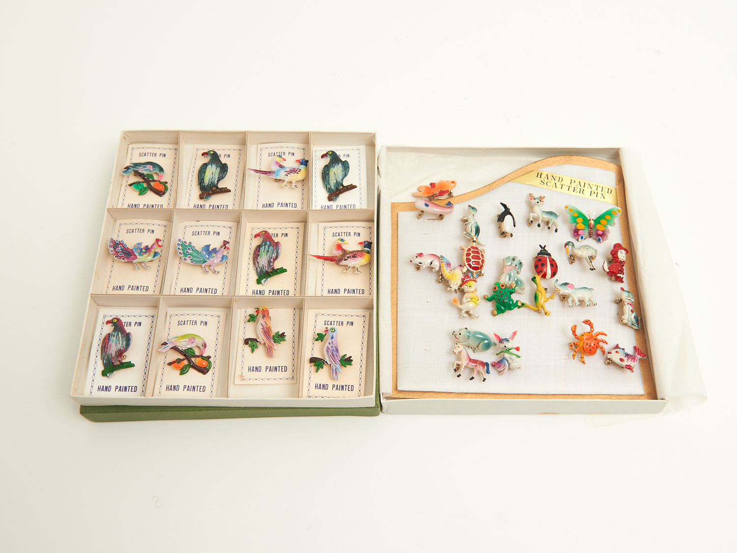 THREE BOXES OF VINTAGE 1960S HAND PAINTED SCATTER PINS ON ORIGINAL BACKING CARDS 18.5 X 17.5CM (BOXES), LEONARD JOEL LOCAL DELIVERY: SMALL