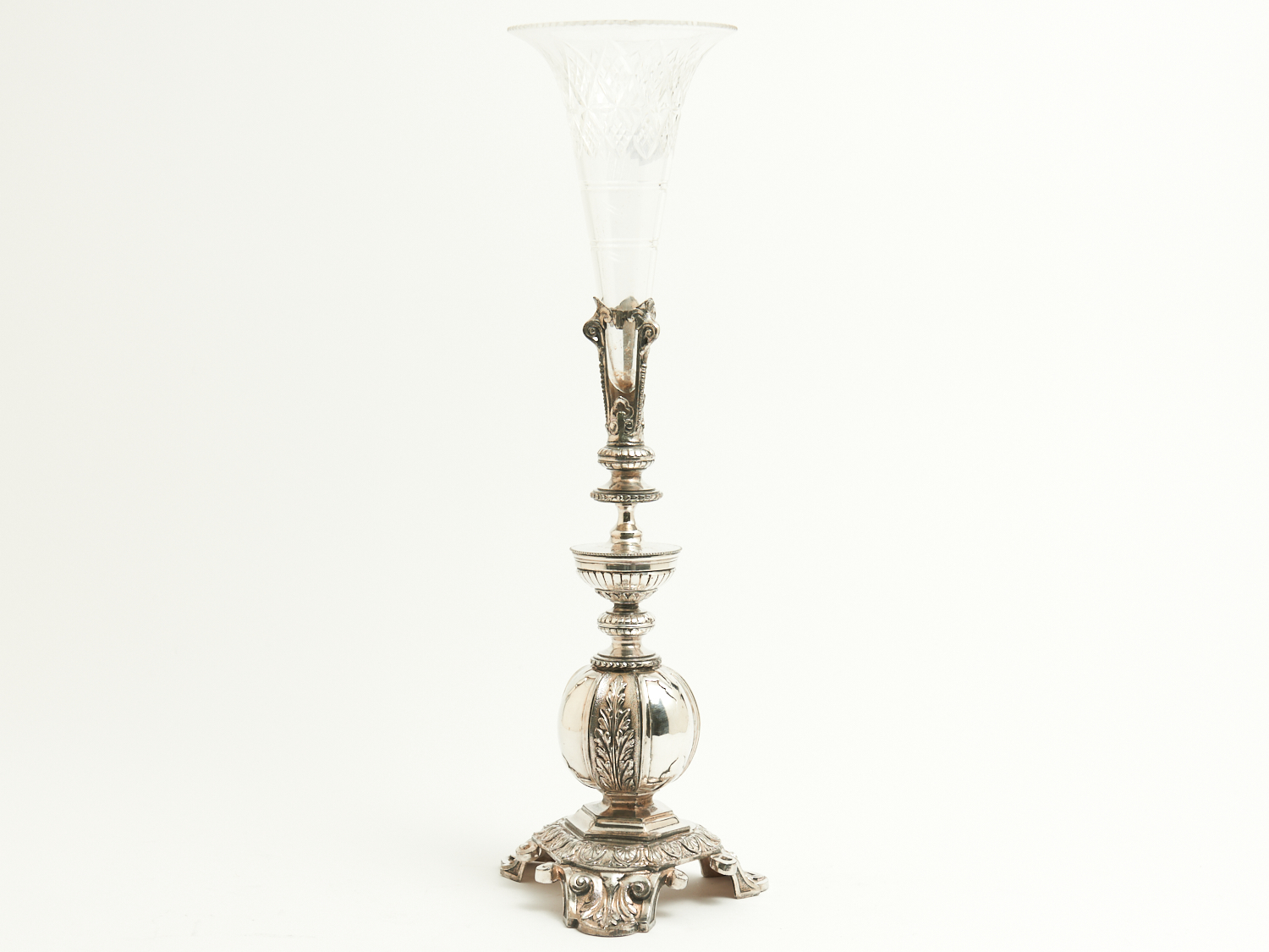 A 19TH CENTURY ENGLISH SHEFFIELD ASHBERRY AND SONS SILVER PLATE AND CUT CRYSTAL TRUMPET EPERGNE H.48CM, LEONARD JOEL LOCAL DELIVERY: SMALL