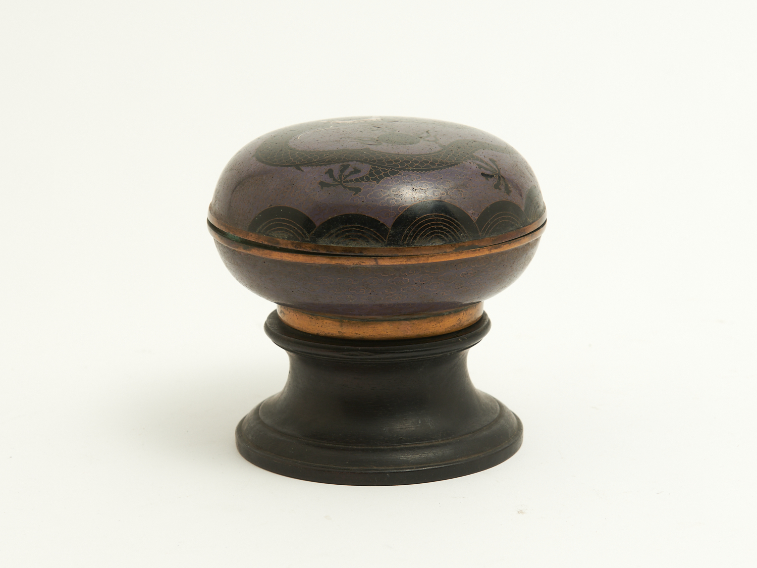 A CHINESE LIDDED CLOISONNE BOX ON SOLID EBONY BASE DECORATED WITH A DRAGON CHASING A PEARL H.12.5CM (TOTAL), LEONARD JOEL LOCAL DELIVERY: SMALL