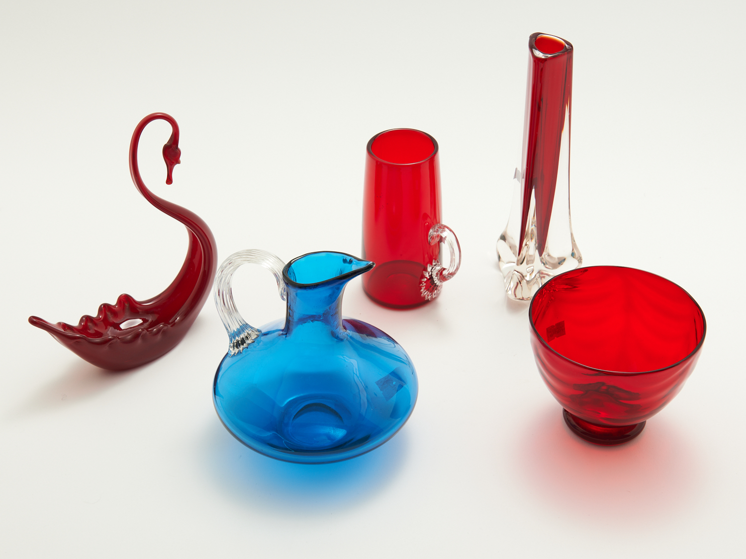 A GROUP OF FIVE PIECES OF ENGLISH WHITEFRIARS INCL. FOUR RUBY AND ONE BLUE GLASS JUG H.24CM, (TALLEST), LEONARD JOEL LOCAL DELIVERY: MEDIUM