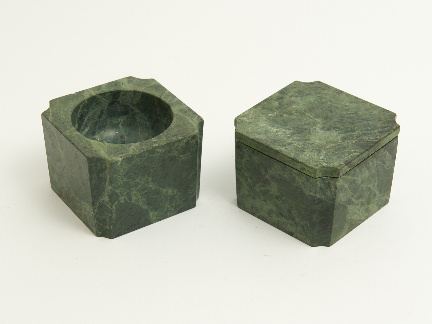 TWO GREEN MARBLE CONTAINERS INCLUDING ONE WITH LID H.8CM, LEONARD JOEL LOCAL DELIVERY: SMALL