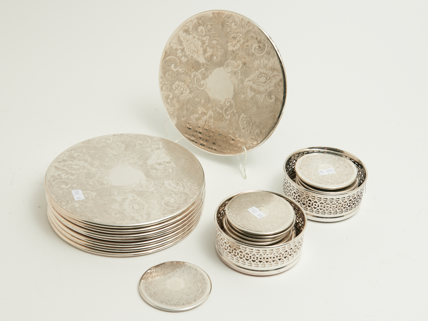 A GROUP OF EIGHT SILVER PLATE PLACEMATS, 16 GLASS COASTERS AND TWO BOTTLE COASTERS DIA.20CM (LARGEST), LEONARD JOEL LOCAL DELIVERY: SMALL
