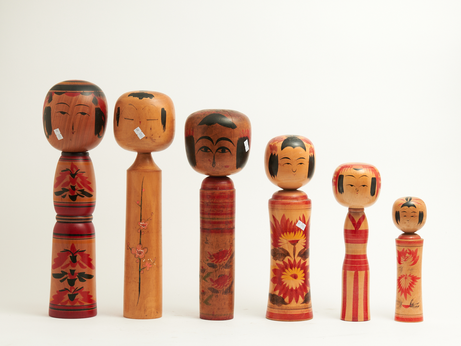 GROUP OF SIX HAND PAINTED KOKESHI DOLLS H.47CM (TALLEST), LEONARD JOEL LOCAL DELIVERY: MEDIUM
