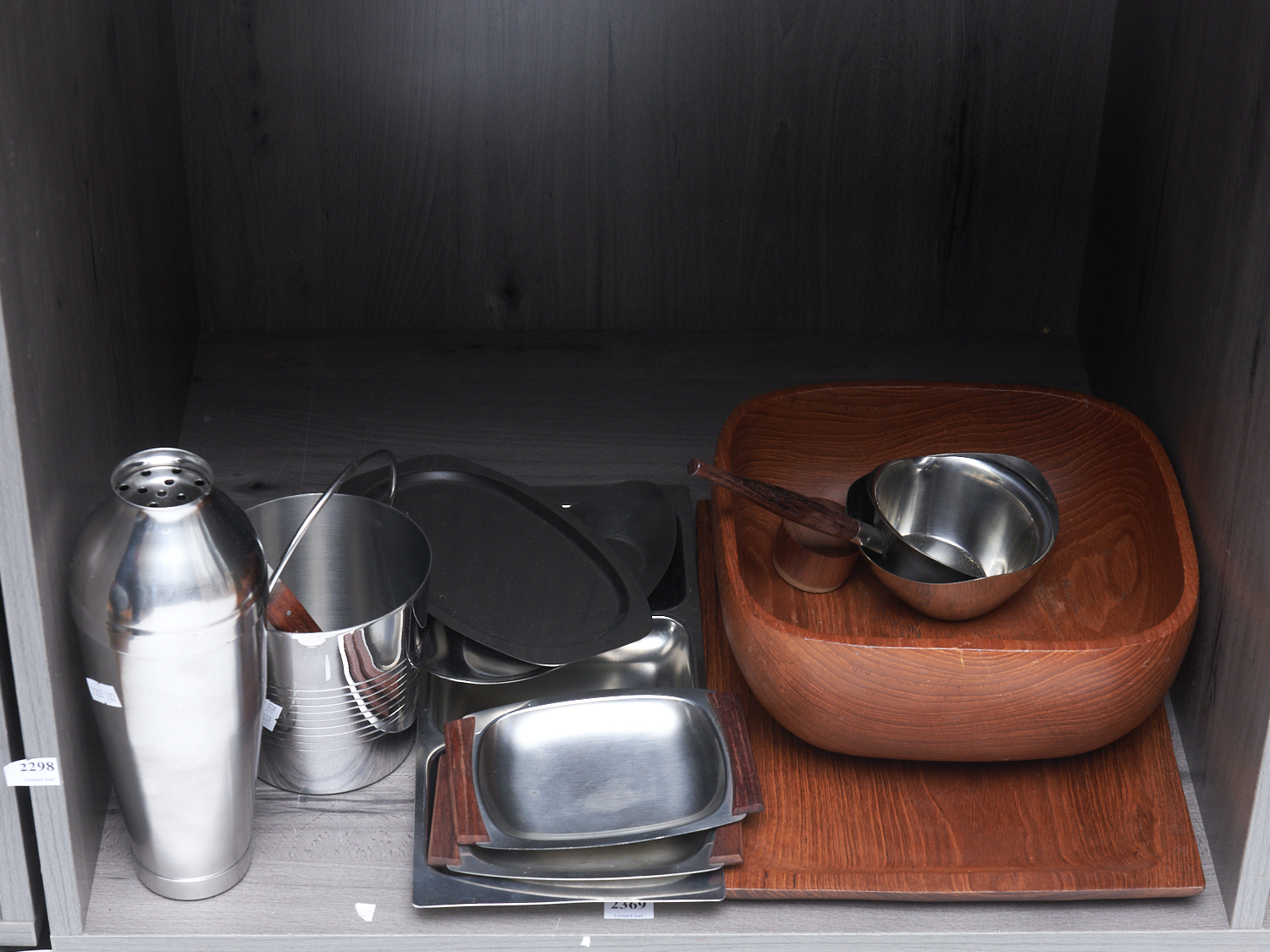 A COLLECTION OF MID CENTURY DANISH STAINLESS STEEL AND TEAK COCKTAIL ITEMS AND SERVING TRAYS AND BOWL L.32.5CM (LONGEST), LEONARD JOEL LOCAL DELIVERY: MEDIUM