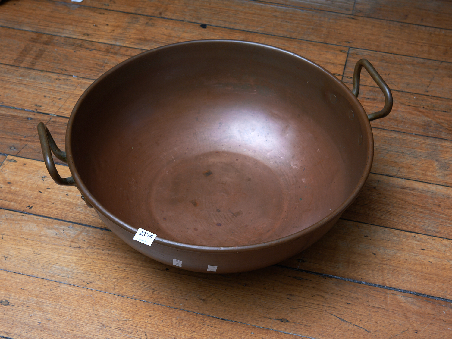A LARGE 19TH CENTURY FRENCH SOLID COPPER AND BRASS HANDLED DOME FORM MIXING BOWL DIA.44CM, LEONARD JOEL LOCAL DELIVERY: MEDIUM