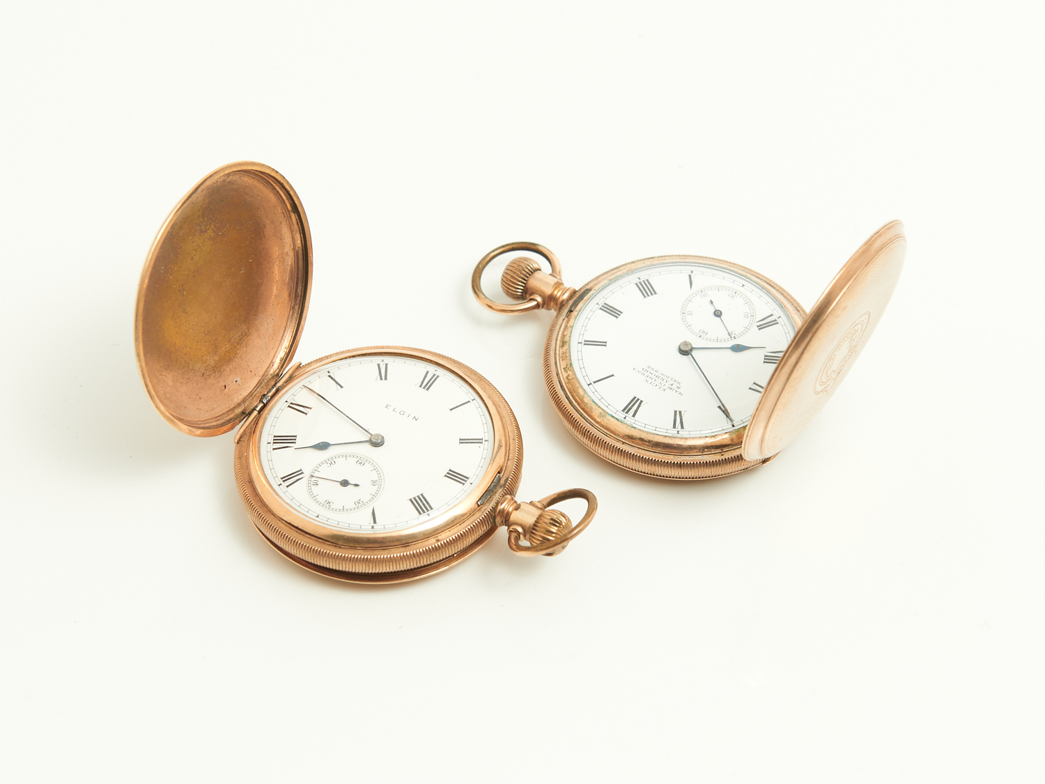 TWO 1900 SWISS MADE ELGIN CROWN WIND FULL HUNTER GOLD PLATED POCKET WATCHES DIA.5CM, LEONARD JOEL LOCAL DELIVERY: SMALL