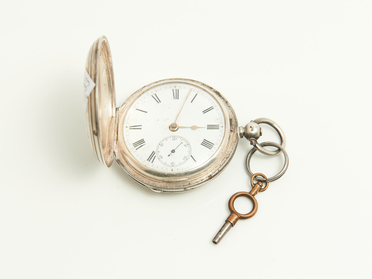 ENGLISH HALLMARKED STERLING SILVER FULL HUNTER POCKET WATCH WITH WHITE ENAMEL DIAL AND ORIGINAL KEY DIA.5CM, LEONARD JOEL LOCAL DELIVERY: SMALL