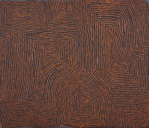 "This painting depicts designs associated with Kaakuratintja (Lake MacDonald). In mythological times a large group of Tingari Men travelled to this site from Kulkuta, south-west of the Tjukula Community. The Kuningka (Western Quoll) Dreaming also travelled this same route. Since events associated with the Tingari Cycle are of a secret nature no further detail was given.