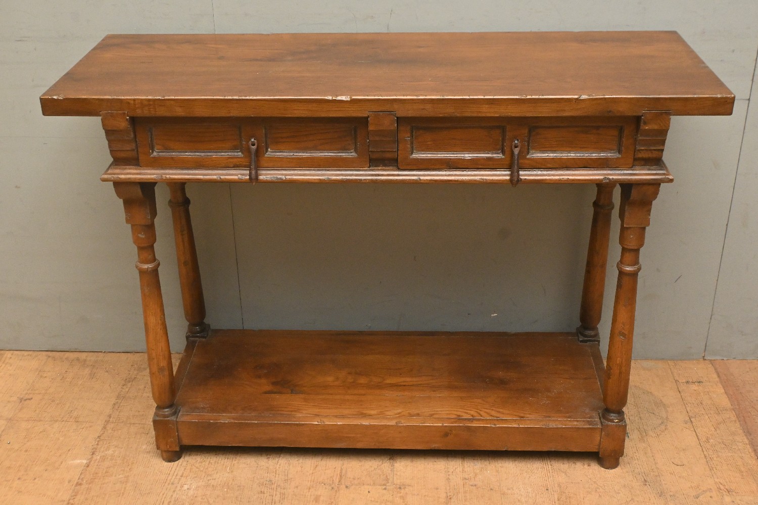 A SPANISH-STYLE OAK SIDE TABLE (81H X 115W X 40D CM) (PLEASE NOTE THIS HEAVY ITEM MUST BE REMOVED BY CARRIERS AT THE CUSTOMER'S EXPENSE. LEONARD JOEL STAFF CANNOT ASSIST CARRYING THIS ITEM) (LARGE ITEM)