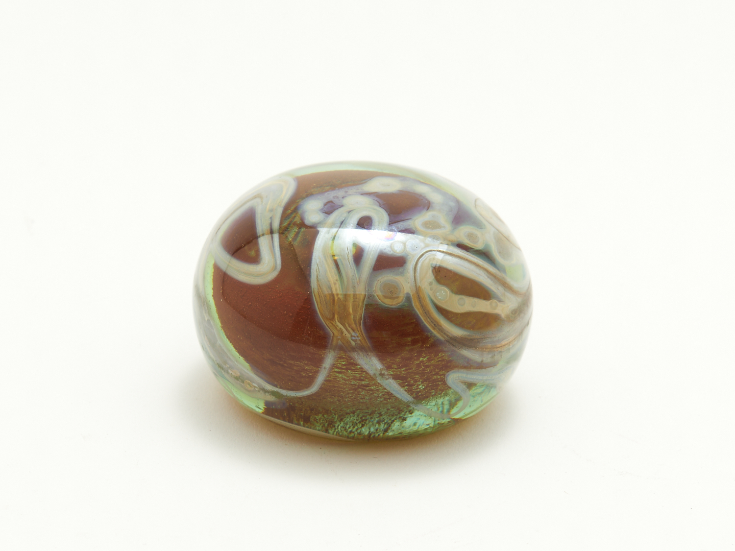 AN ART GLASS PAPERWEIGHT WITH BROWN BASE AND A SEMI-IRIDESCENT FINISH DIA.8CM, LEONARD JOEL DELIVERY SIZE: SMALL