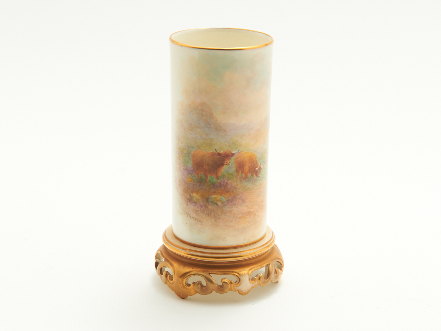 A ROYAL WORCESTER SPILL VASE WITH HAND-PAINTED HIGHLAND CATTLE AND RETICULATED FOOT, SIGNED H.STINTON H.16CM, LEONARD JOEL DELIVERY SIZE: SMALL