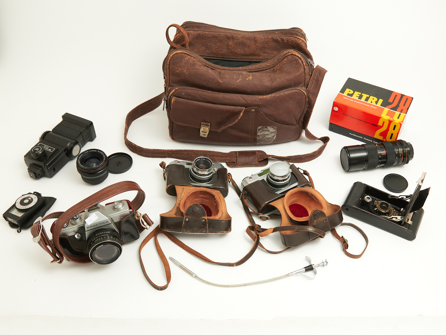 A COLLECTION OF VINTAGE CAMERAS, LENSES, CASES, BAGS AND ACCESSORIES INCLUDING TWO PETRI SLRS AND A PRACTICA L.33CM (BAG), LEONARD JOEL DELIVERY SIZE: MEDIUM