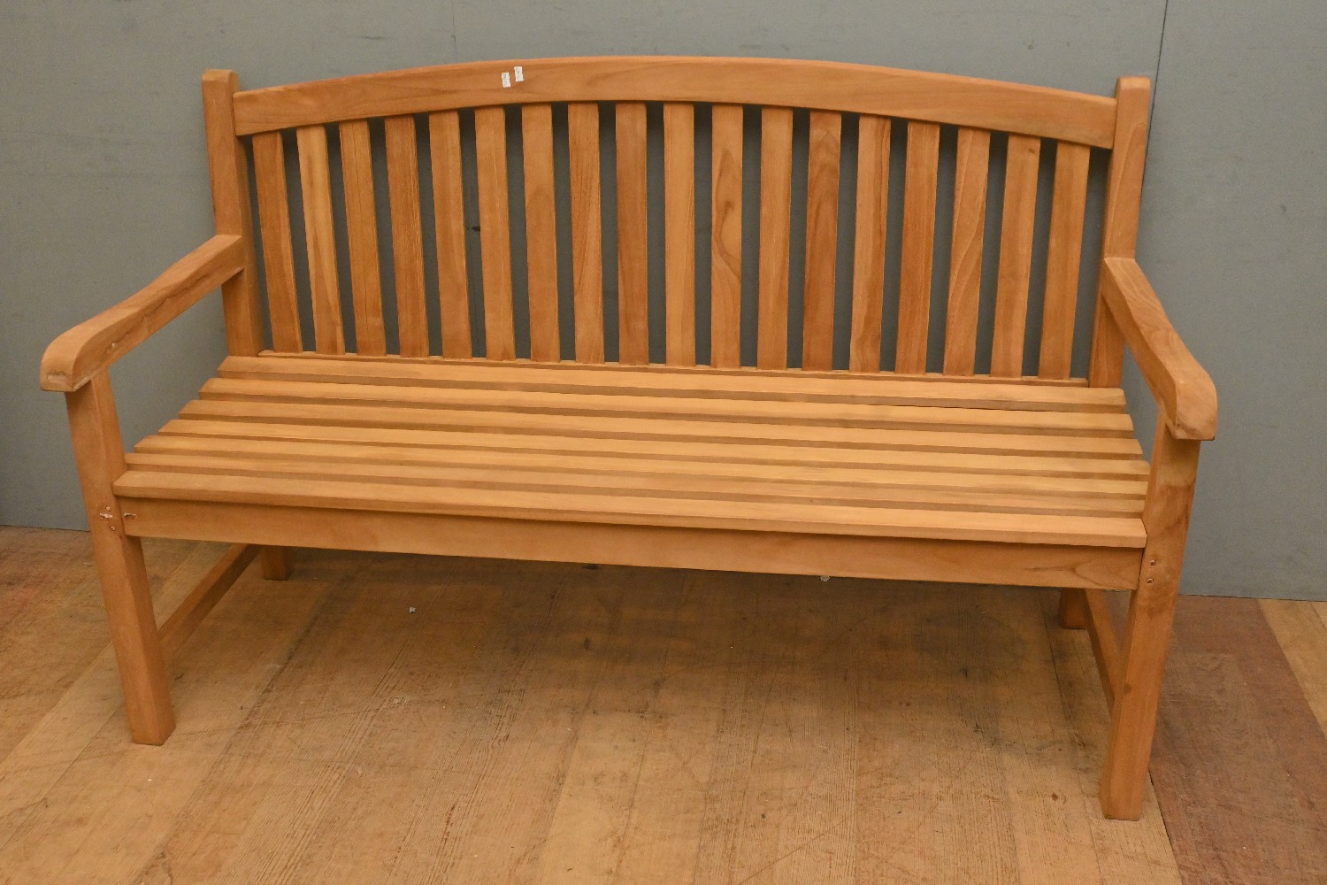 A TEAK GARDEN BENCH SEAT (94H X 150W X 61D CM) (PLEASE NOTE THIS HEAVY ITEM MUST BE REMOVED BY CARRIERS AT THE CUSTOMER'S EXPENSE. LEONARD JOEL STAFF CANNOT ASSIST CARRYING THIS ITEM) (LARGE ITEM)