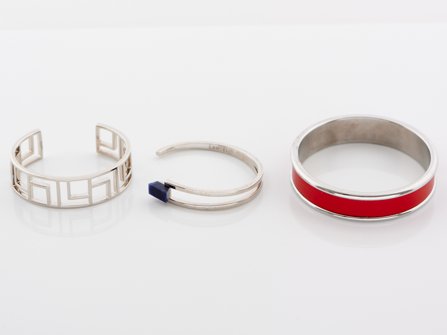 LANCEL, A BANGLE AND TWO CUFFS IN SILVER, EACH ACCOMPANIED BY A POUCH AND BOX
