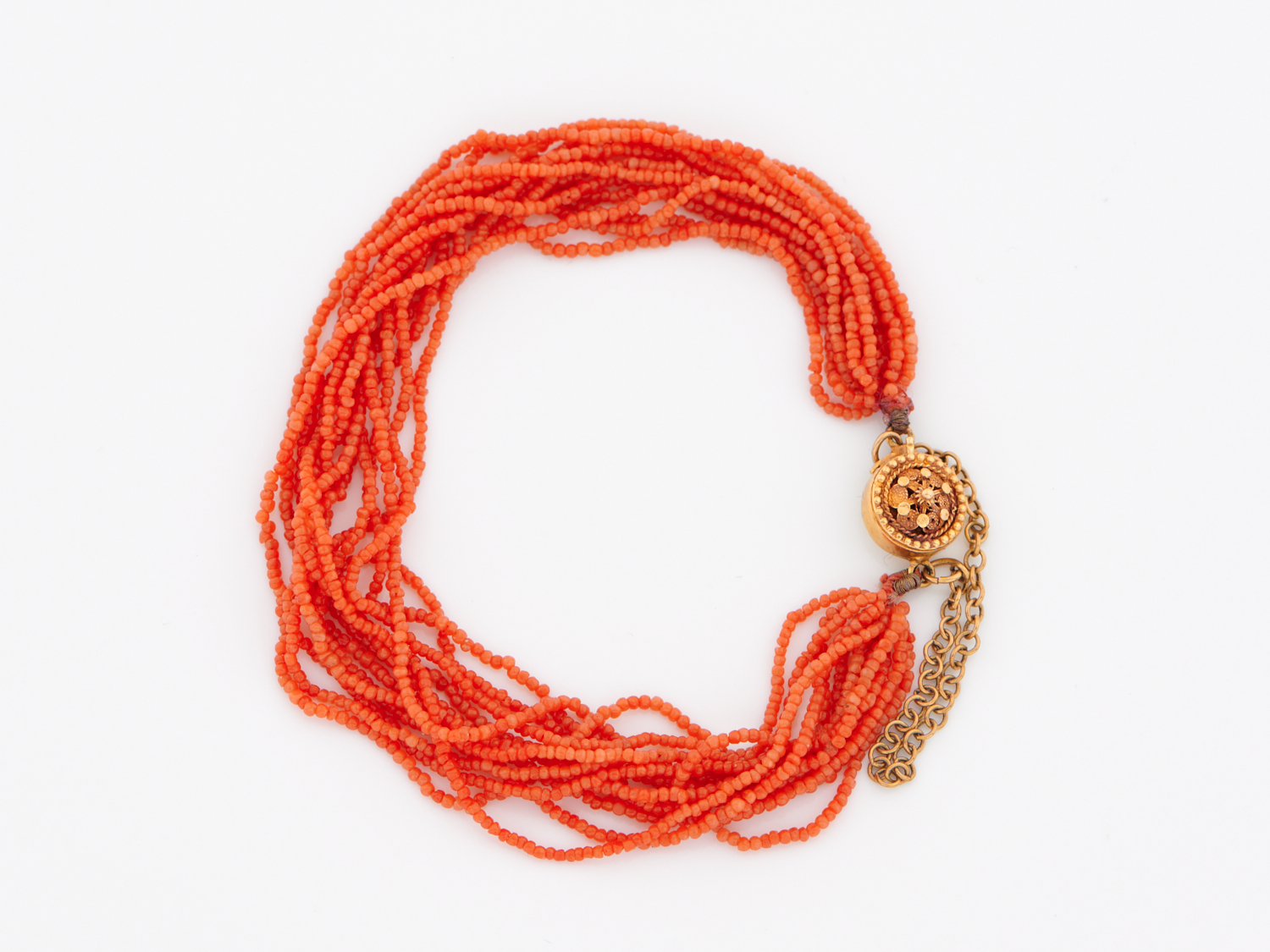 A FINE ANTIQUE MULTI-STRAND CORAL BRACELET TO A CLASP IN 18CT GOLD,