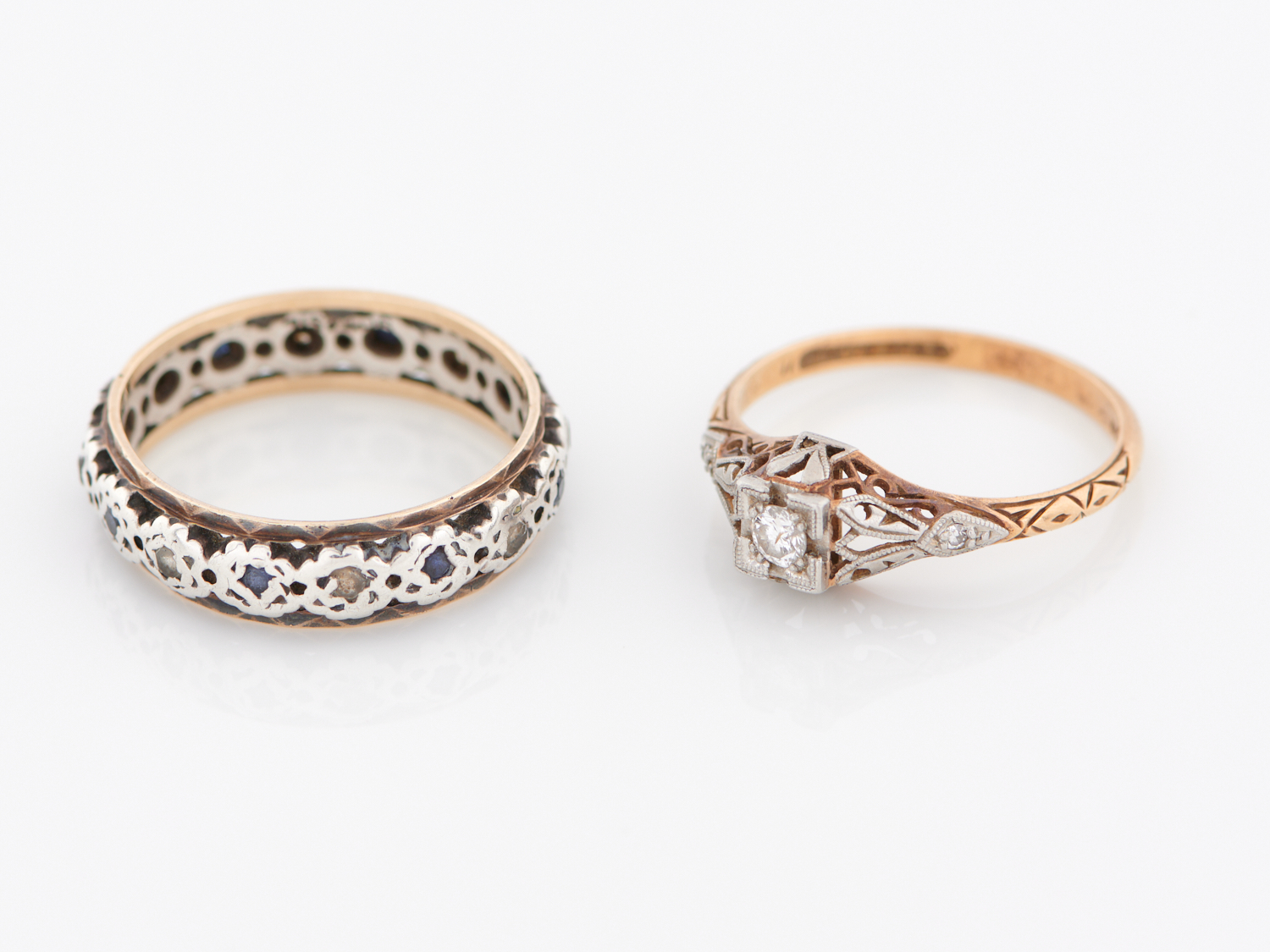 AN ANTIQUE DIAMOND RING IN PLATINUM AND 18CT GOLD, TOGETHER WITH A BLUE AND WHITE SAPPHIRE RING IN 9CT GOLD AND SILVER, RING SIZES P1/2 AND N, TOTAL WEIGHT 5.6GMS