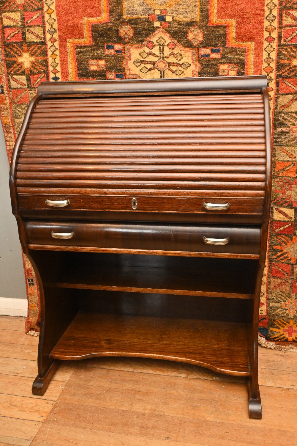 AN ART DECO OAK AND WALNUT ROLL TOP BUREAU - UNLOCKED NO KEY (116H X 83W X 48D CM) (PLEASE NOTE THIS HEAVY ITEM MUST BE REMOVED BY CARRIERS AT THE CUSTOMER'S EXPENSE. LEONARD JOEL STAFF CANNOT ASSIST CARRYING THIS ITEM) (X-LARGE ITEM)