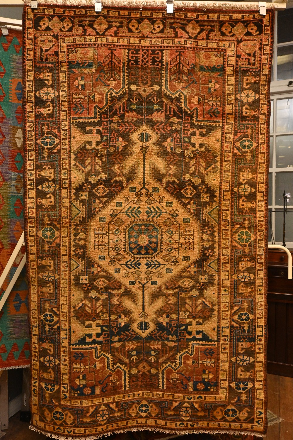 A TRIBAL PERSIAN TOYSERKAN RUG, 100% WOOL & NATURAL DYES. HAND-KNOTTED VILLAGE WEAVE WITH TRIBAL DESIGN OF HEXAGONAL ANCHORED MEDALLION & CORNER MEDALLIONS ON A FIELD OF GEOMETRIC PATTERNS & LEAF FORMS. BORDER OF ROSETTES & TRIBAL MOTIFS. ORIGIN: IRAN- SIZE: 218 X 152 CM