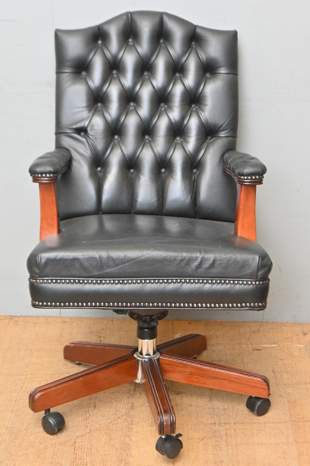 AN EARLY 20TH CENTURY-STYLE LEATHER-UPHOLSTERED SWIVELLING DESK CHAIR (A/F) (103H X 58W X 78D CM) (LEONARD JOEL DELIVERY SIZE: X-LARGE)