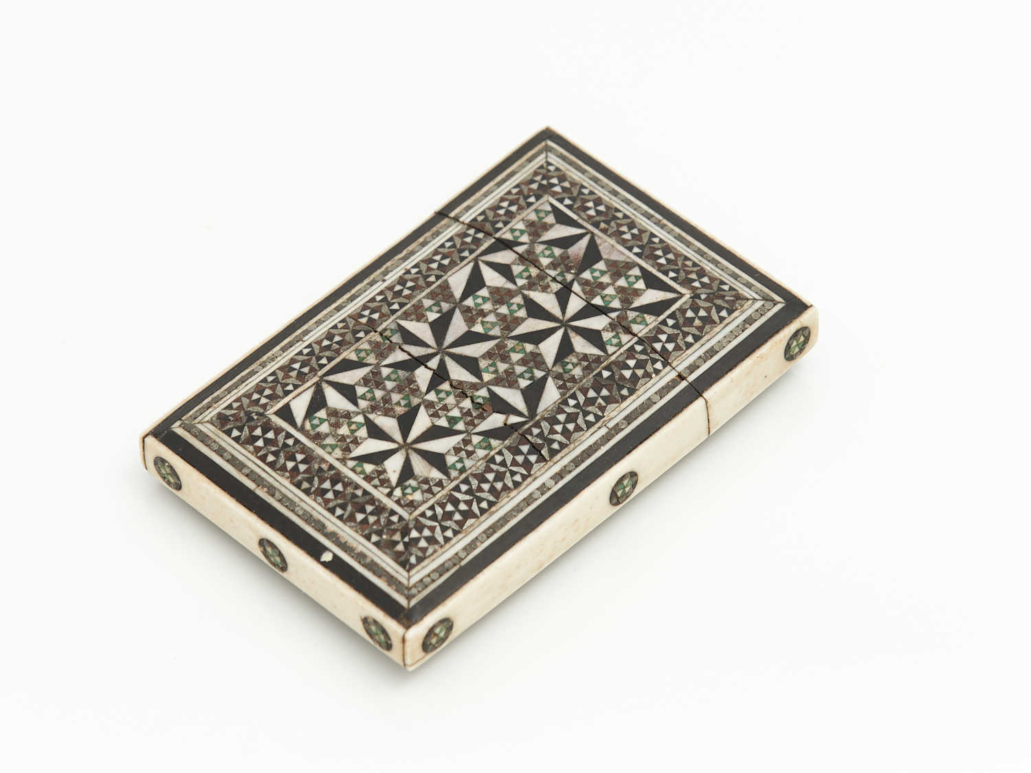 A LATE 19TH CENTURY ANGLO-INDIAN MICRO MOSAIC SADELI CARD CASE WITH EBONY, ROSEWOOD, BONE, SILVER AND GREEN STONE INLAY L.8.2CM (A/F), LEONARD JOEL DELIVERY SIZE: SMALL