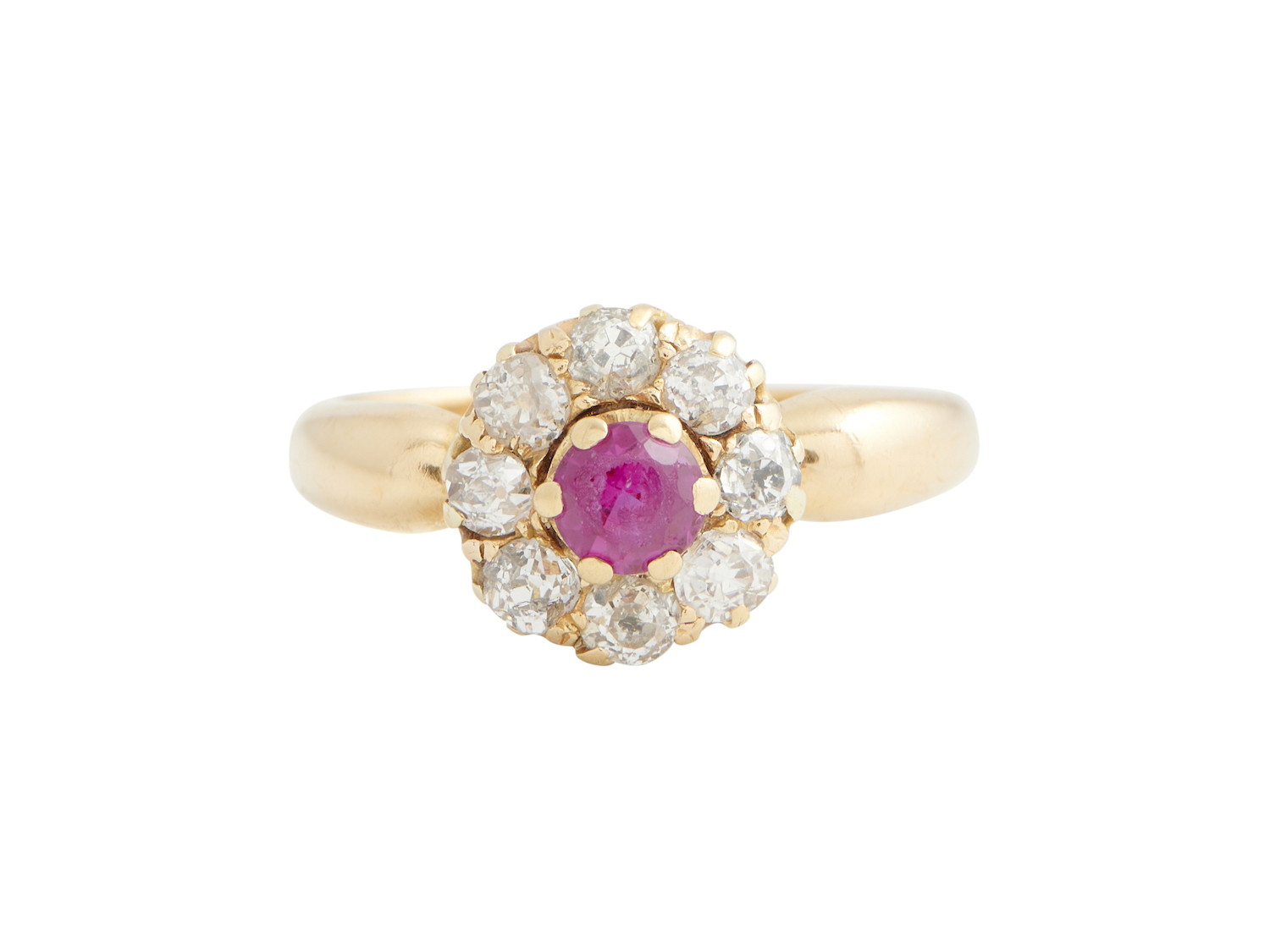Of cluster design, centring a claw-set circular-cut ruby, framed by a halo of old European-cut diamonds, the diamonds together weighing approximately 0.30 carats, mounted in 18ct gold, size J, gross weight approximately 3 grams, Chester hallmarks, 1896.