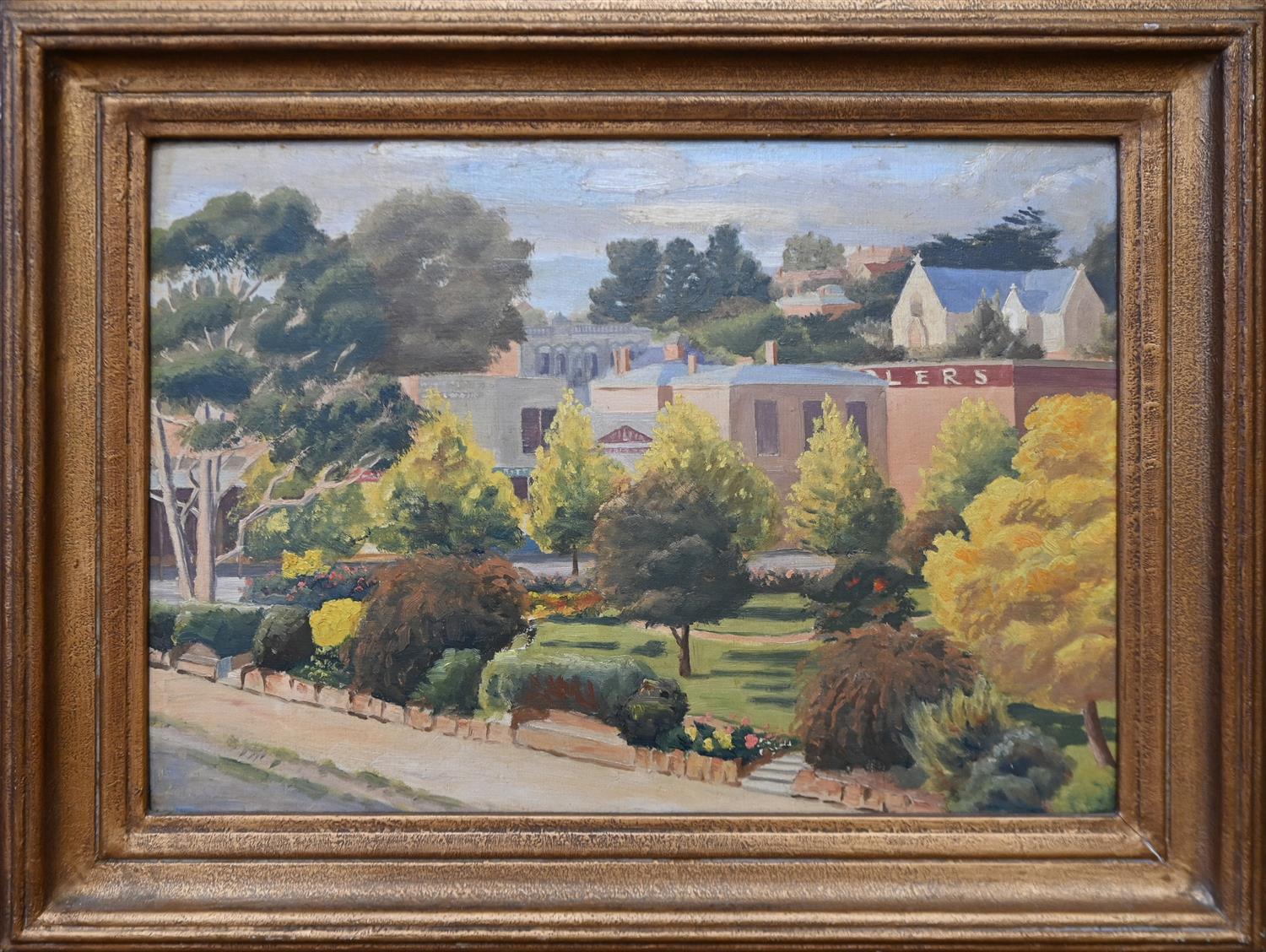 COLIN HOLT, VICTORY PARK CASTLEMAINE 1944, OIL ON BOARD, SIGNED LOWER LEFT, TITLE INSCRIBED VERSO, 37.5 X 51CM, FRAME SIZE: 52 X 65CM