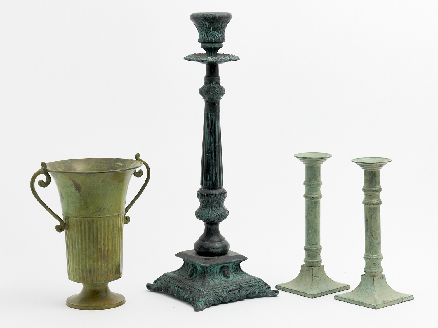 A CAST METAL CANDLESTICK, A PAIR OF SMALL CANDLESTICKS AND A SMALL METAL URN H.49CM (TALLEST), LEONARD JOEL DELIVERY SIZE: MEDIUM