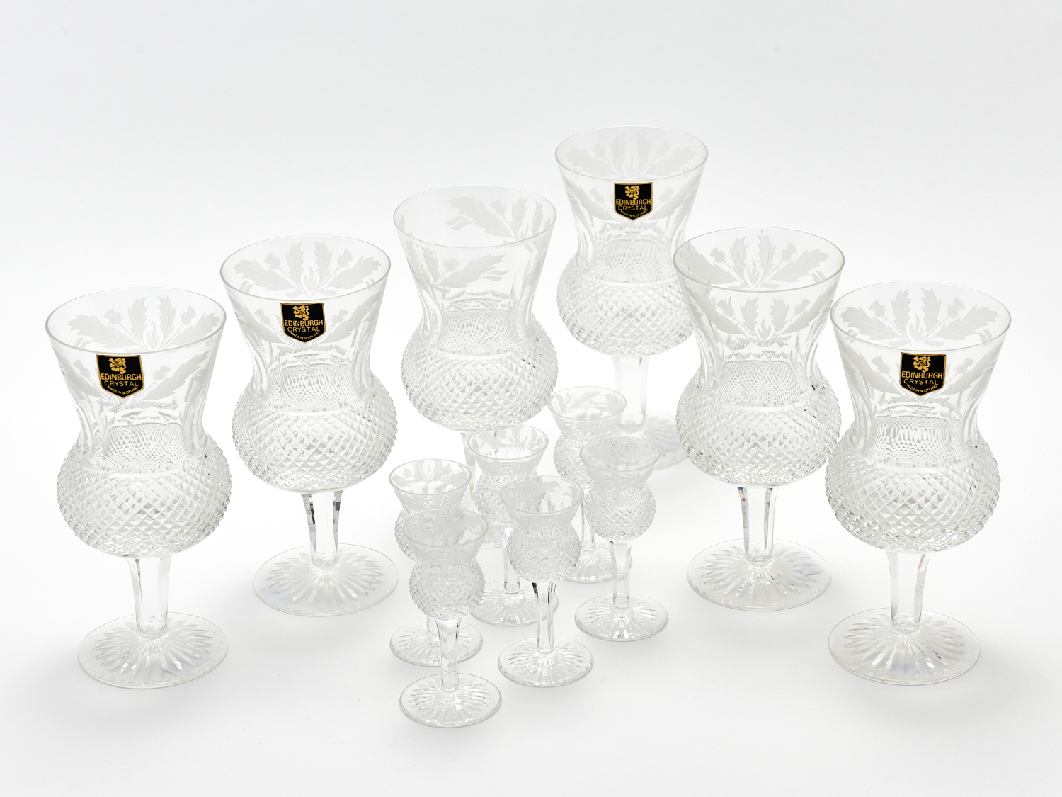 A SET OF SIX EDINBURGH CRYSTAL WINES AND SIX LICQUORS H.17CM (TALLEST), LEONARD JOEL DELIVERY SIZE: MEDIUM
