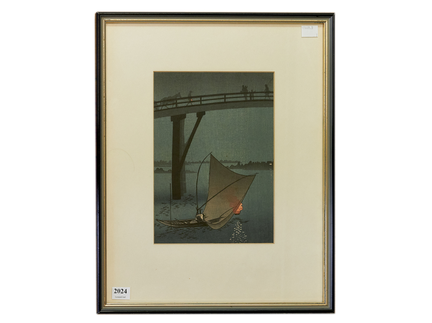 JAPANESE WOODBLOCK IN THE STYLE OF HIROSHIGE, NIGHT SCENE, 23.5 X 16CM, FRAME SIZE: 41.5 X 33CM, LEONARD JOEL DELIVERY SIZE: MEDIUM