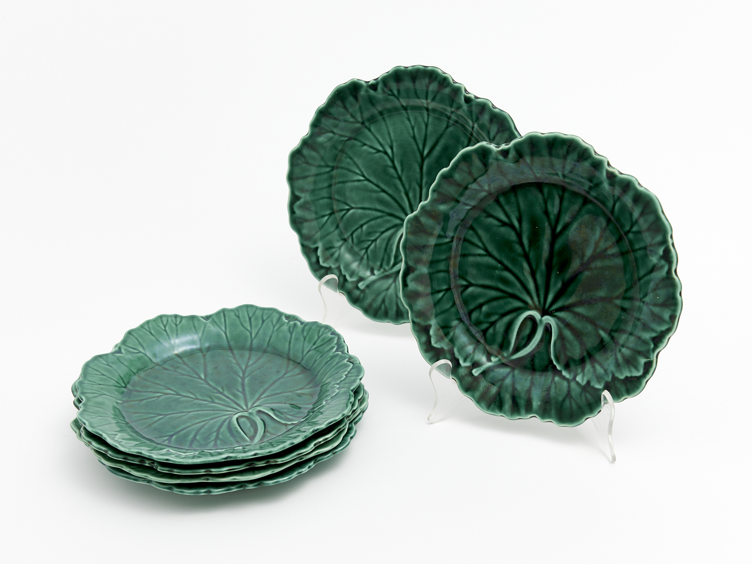 A SET OF SIX WEDGWOOD MAJOLICA CABBAGE LEAF PLATES DIA.20CM, LEONARD JOEL DELIVERY SIZE: SMALL