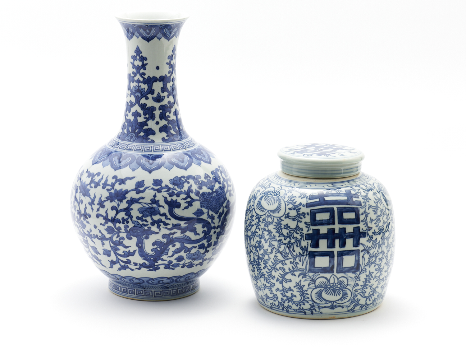 A LARGE CHINESE BLUE AND WHITE VASE AND A GINGER JAR WITH COVER H.43.5CM (TALEST), LEONARD JOEL DELIVERY SIZE: LARGE