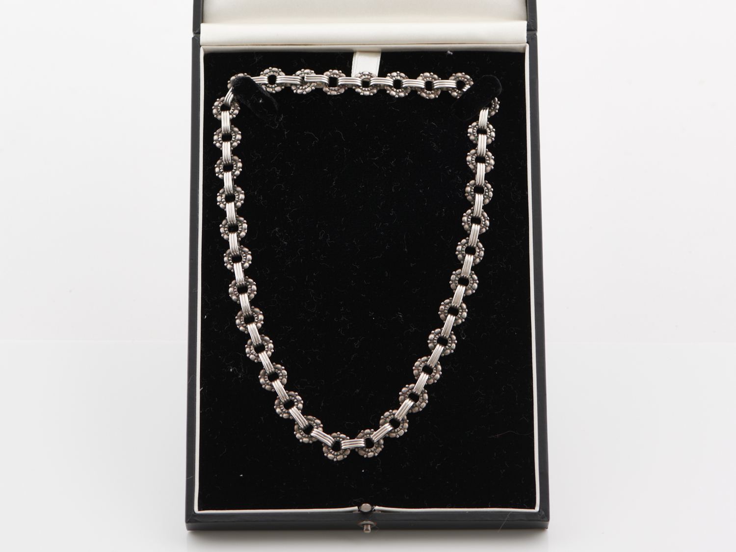 A FANCY LINK NECKLACE IN SILVER, RETAILED BY KOZMINSKY, 440MM, ACCOMPANIED BY A KOZMINSKY BOX