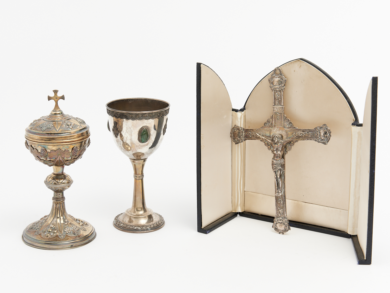 THREE ECCLESIASTICAL SILVER ITEMS INCLUDING A SEMI PRECIOUS INSET STONE CHALICE, A CIBORIUM AND A CRUCIFIX IN A LEATHER AND SILK CASE 516G (TOTAL WEIGHT) H.20.5CM (TALLEST), LEONARD JOEL DELIVERY SIZE: SMALL