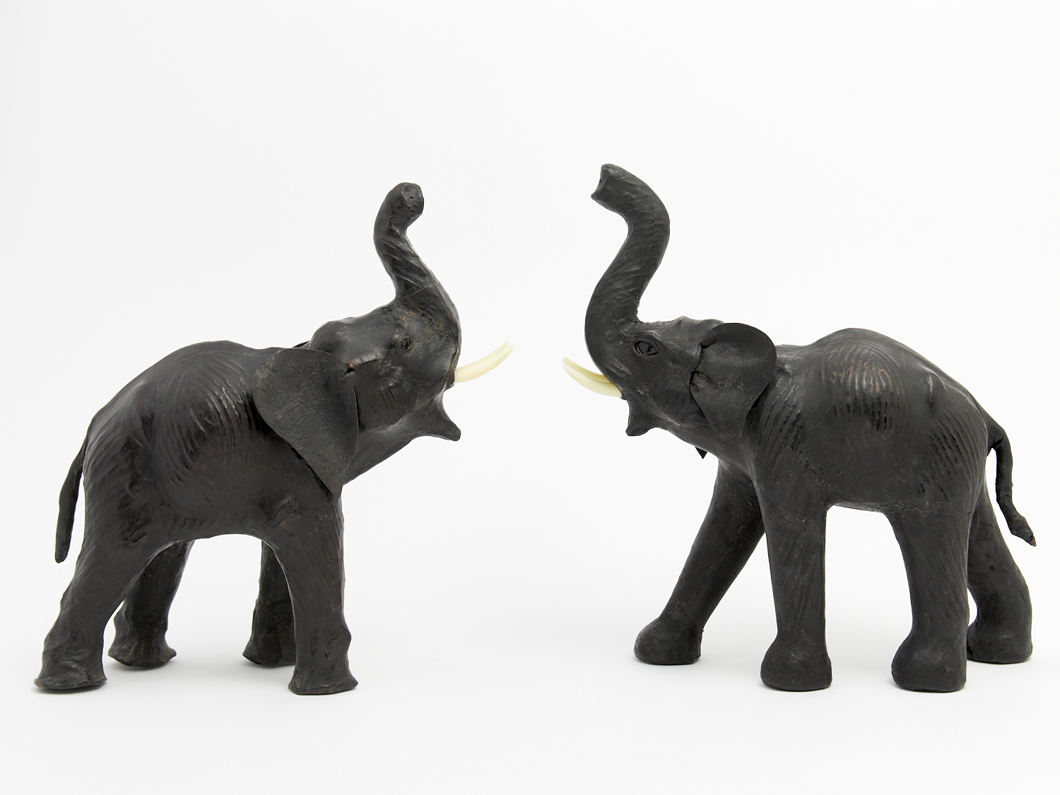 A PAIR OF HAND-MADE LEATHER COVERED MODEL ELEPHANTS H.35CM, LEONARD JOEL DELIVERY SIZE: MEDIUM