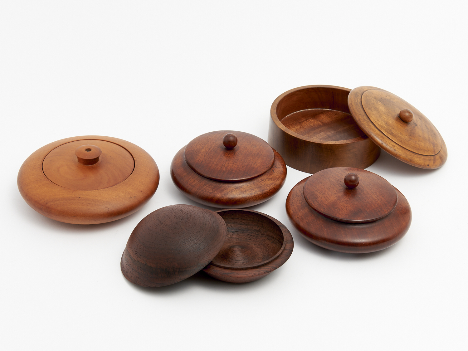 FIVE ARTISAN MADE TURNED WOOD BOXES DIA.14.5CM (LARGEST), LEONARD JOEL DELIVERY SIZE: SMALL