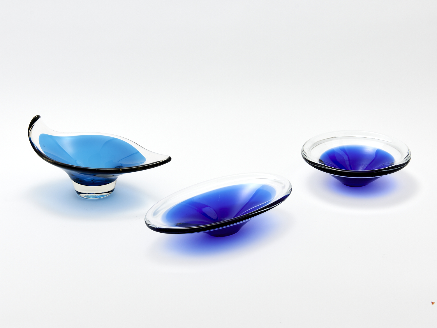 A MID-CENTURY WHITEFRIARS KING-FISHER BLUE GLASS BOWL WITH ORIGINAL STICKER AND TWO OTHER BLUE GLASS BOWLS, LEONARD JOEL DELIVERY SIZE: MEDIUM