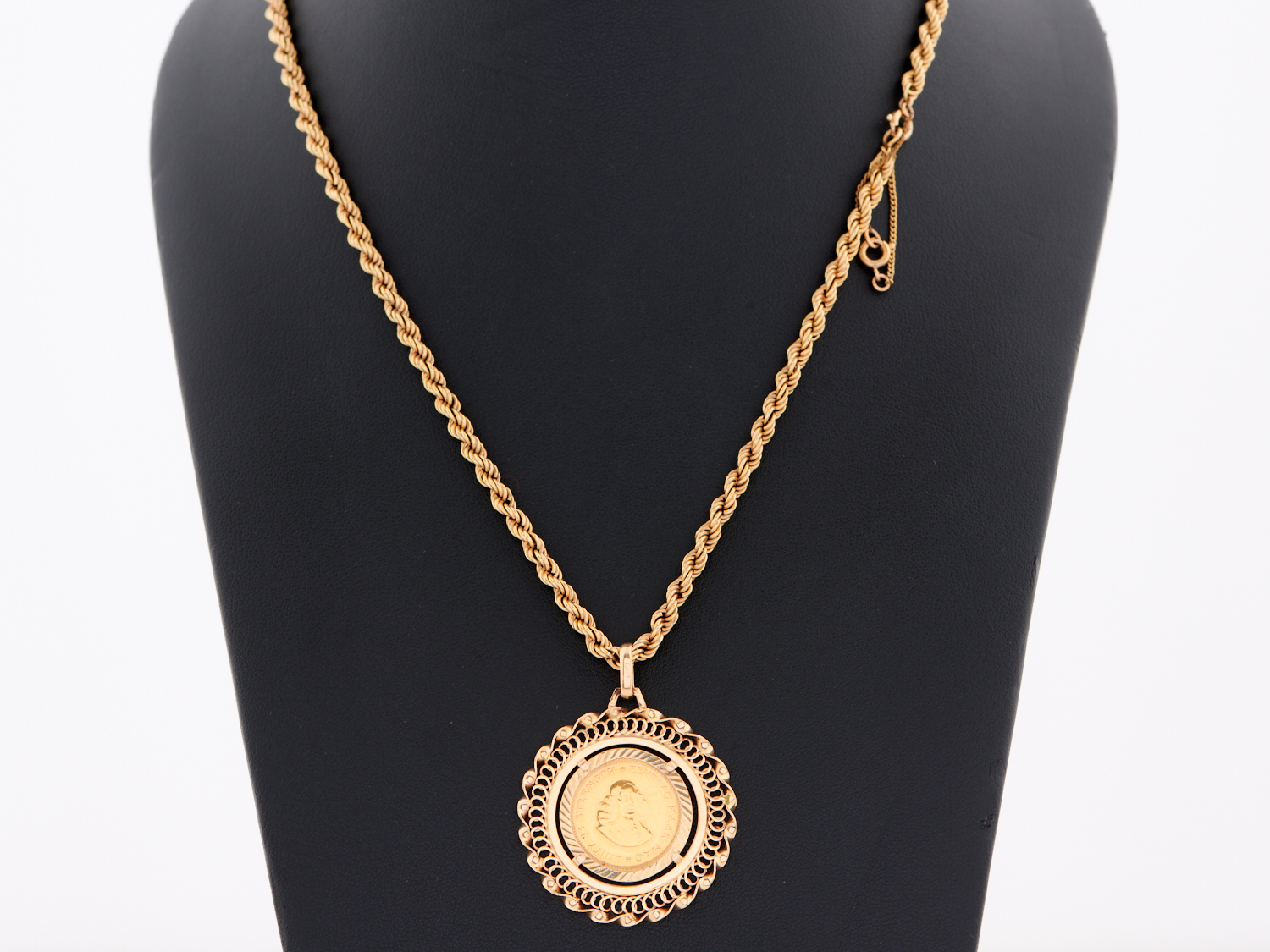 A KRUGERRAND COIN IN HIGH CARAT GOLD MOUNTED IN 15CT GOLD TO A ROPE TWIST CHAIN IN 15CT GOLD, 28.7GMS