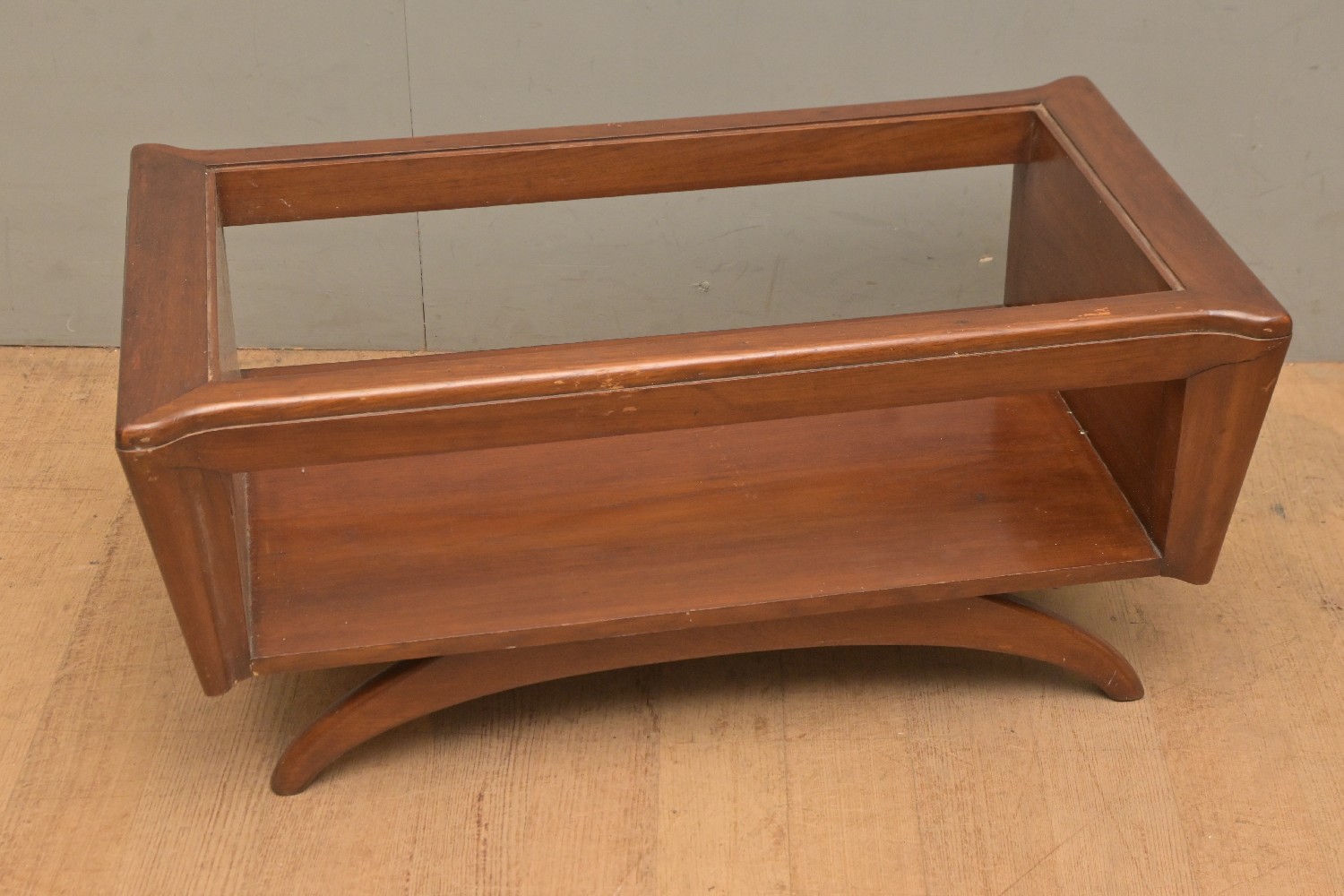 A TWO TIER COFFEE TABLE -GLASS TOP MISSING (A/F) (40H X 89W X 50D CM) (LEONARD JOEL DELIVERY SIZE: LARGE)