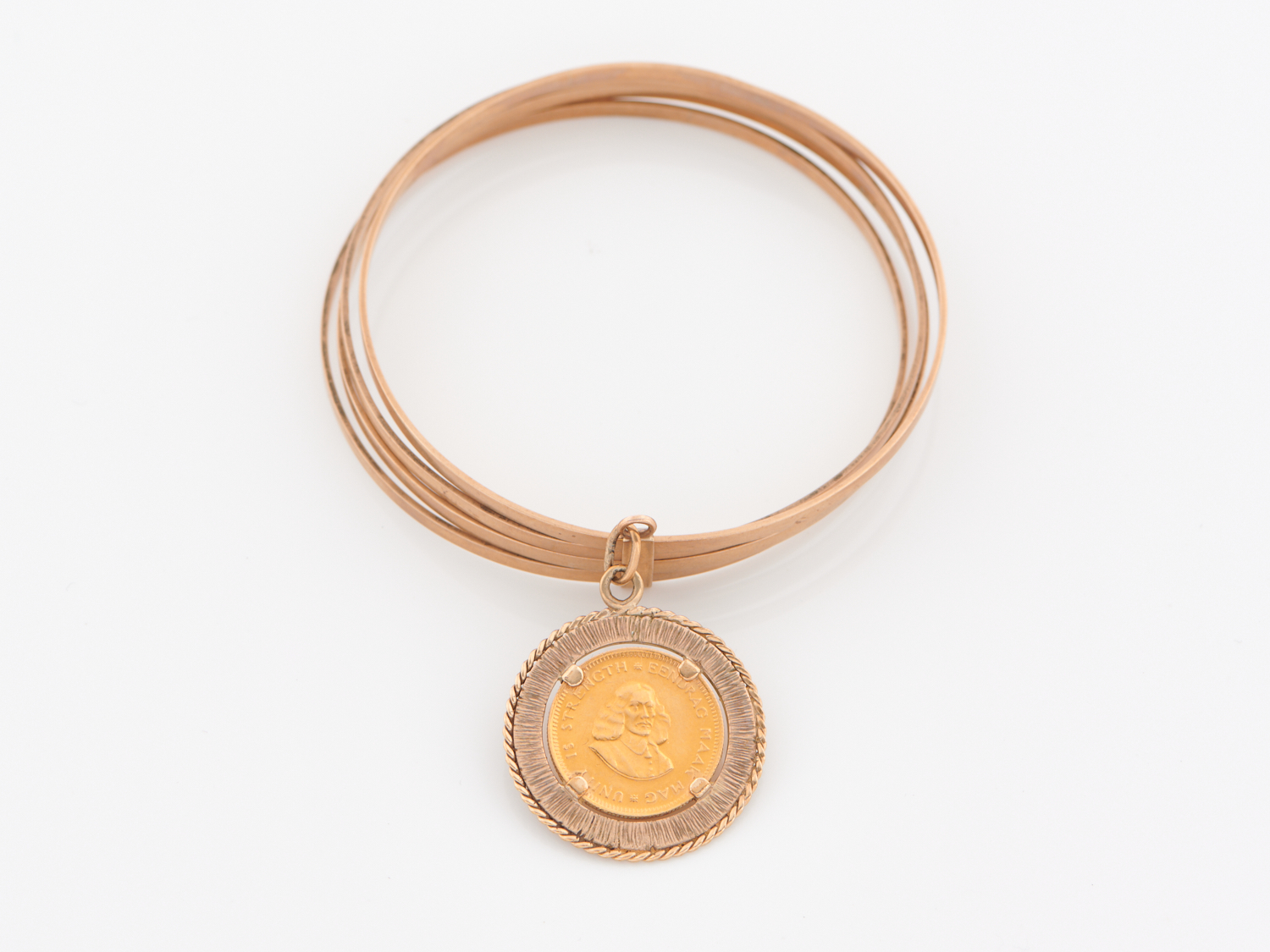 A KRUGERRAND COIN IN HIGH CARAT GOLD MOUNTED IN 9CT TO A FOUR SET BANGLE IN 9CT GOLD, 28.7GMS